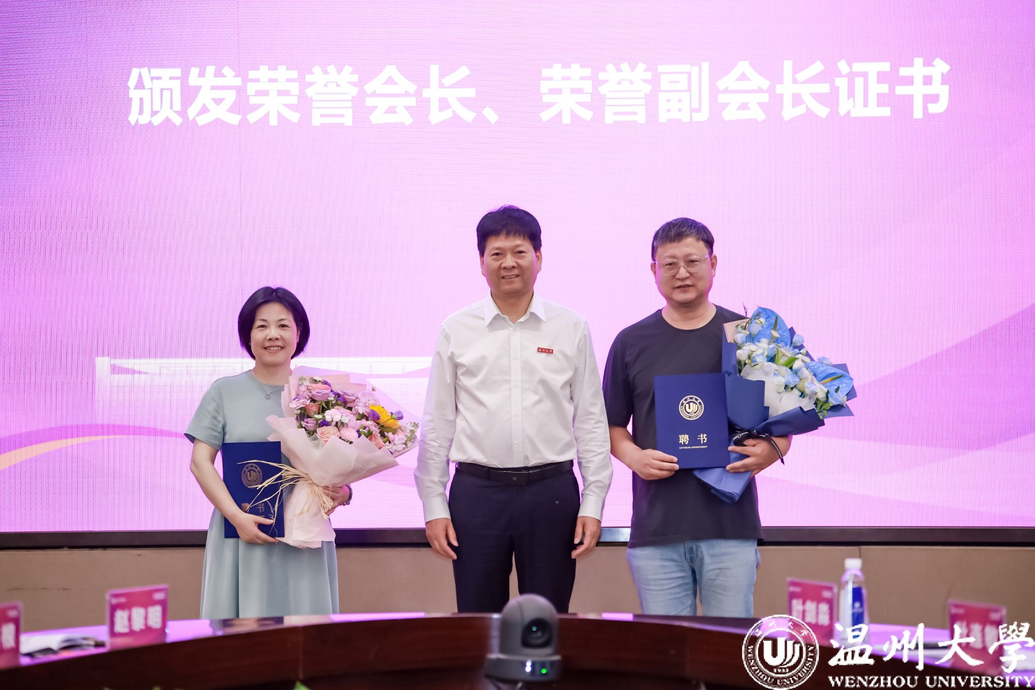 党委副书记庄兴忠为荣誉会长王仲辉、荣誉副会长张素琴颁发聘书。