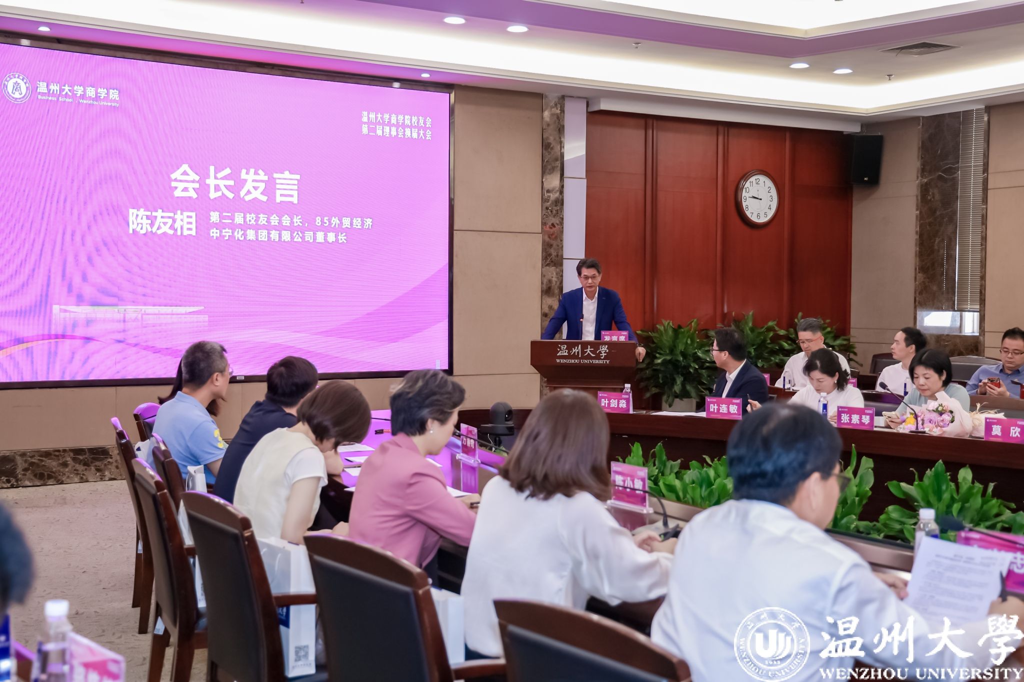 新任会长陈友相作任职发言。作为85级外贸经济专业校友,陈友相深情回顾了在母校的学习经历,强调将以实际行动践行服务承诺,秉持“两个助”初心——助推母校发展、助力校友进步。他提出“三个有”的履职目标:在“有担当”层面,承诺以三个“全心全意”构建服务矩阵,聚焦校友成长、母校发展和社会贡献;在“有作为”方向,强调延续往届理事会“差异化”发展路径,通过“联珠成链、结网聚力”深化校友联络机制,持续打造名企游学、校友沙龙等品牌活动;在“有做到”维度,提出以“四向”理念推动组织建设——培育“向阳”的积极生态,构建“向善”的互助文化,激发“向上”的进取精神,建立“向好”的规范体系。他号召校友争当“行业的带头人、形象的代言人、项目的联系人、爱校的责任人”,鼓励广大校友回馈母校,为母院发展添砖加瓦。