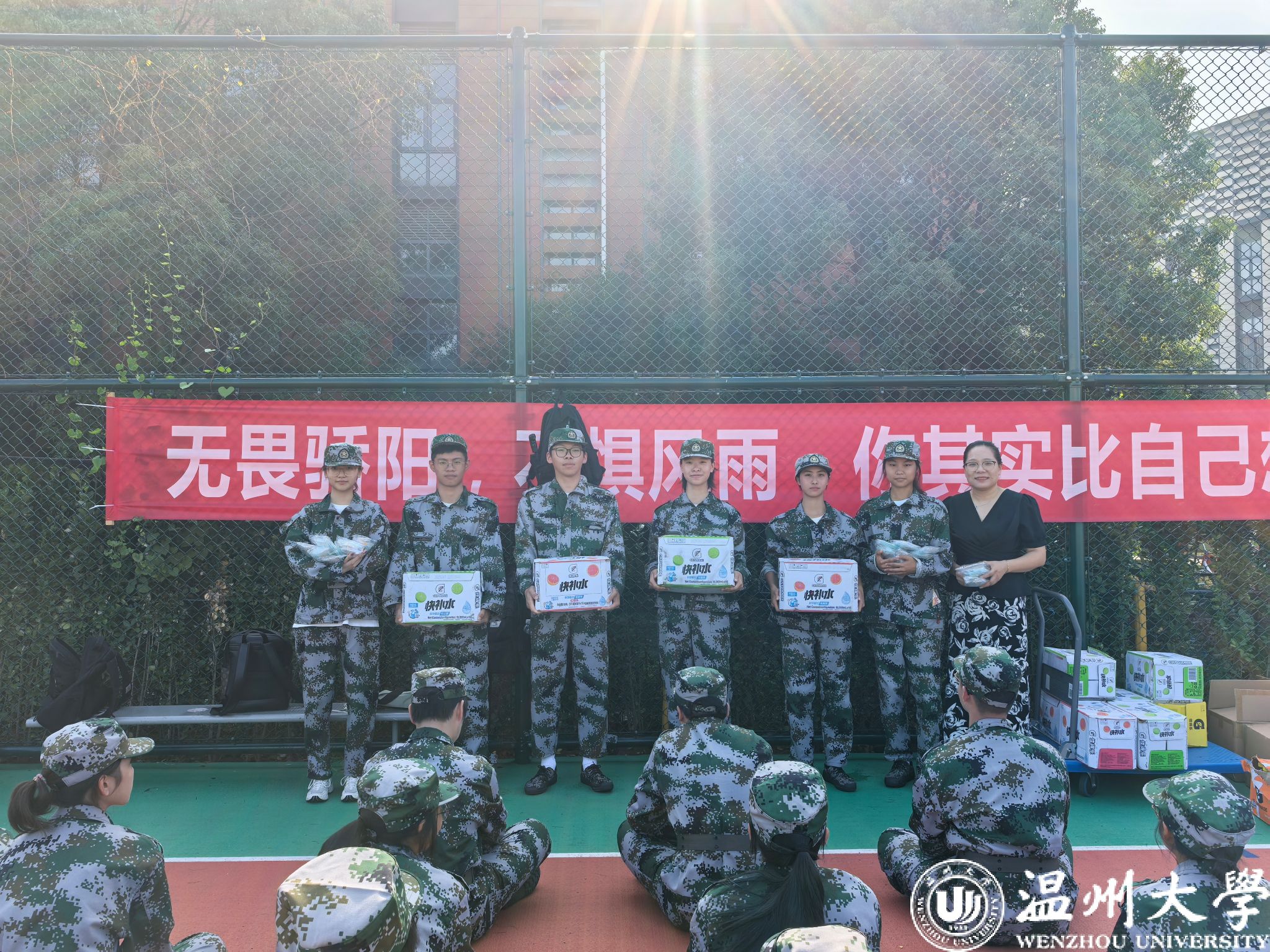向全体参训学生表示诚挚问候,并指出,军训是大学生成长的重要一课,不仅锻炼体魄、磨练毅力,更是培养纪律意识和集体荣誉感的宝贵经历。她鼓励同学们珍惜训练机会,将军训中形成的坚韧品质和协作精神延续到今后的学习生活中,为大学生涯开好头、起好步。她还对教官们的严格施训和辛勤付出表示衷心感谢。随后,各位老师为同学们和教官送上了功能饮料和冰冰贴,叮嘱大家科学防暑、合理补水,以更好的状态完成训练。