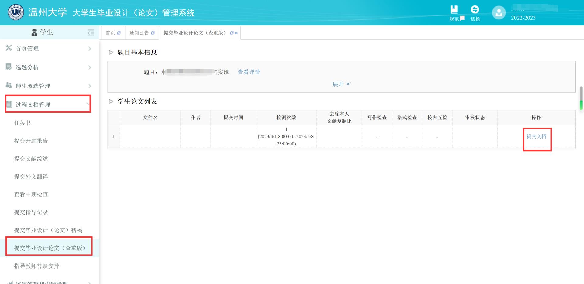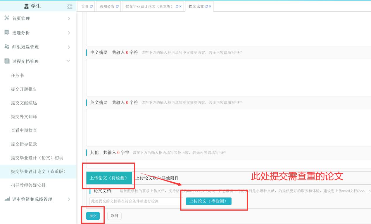 2.提交方式:学生将论文上传至过程文档管理-提交毕业设计论文(查重版),指导教师审核通过后,系统会自动查重,请指导教师慎重操作。如指导教师返回修改,系统将不查重,由学生修改后原地重新提交,直至审核通过才会查重。(注:红字部分为重要提示)