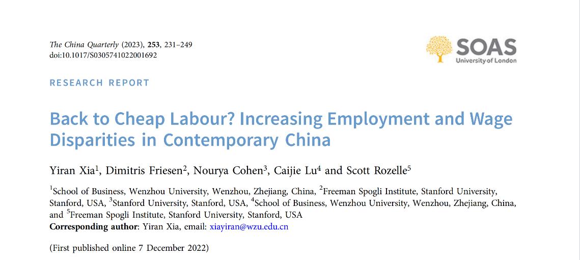 夏怡然教授以第一和通讯作者身份,和斯坦福大学的罗斯高(Scott Rozelle)教授团队合作,在区域与中国研究领域SSCI权威期刊The China Quarterly发表题为《Back to Cheap Labour? Increasing Employment and WageDisparities in Contemporary China》的论文。