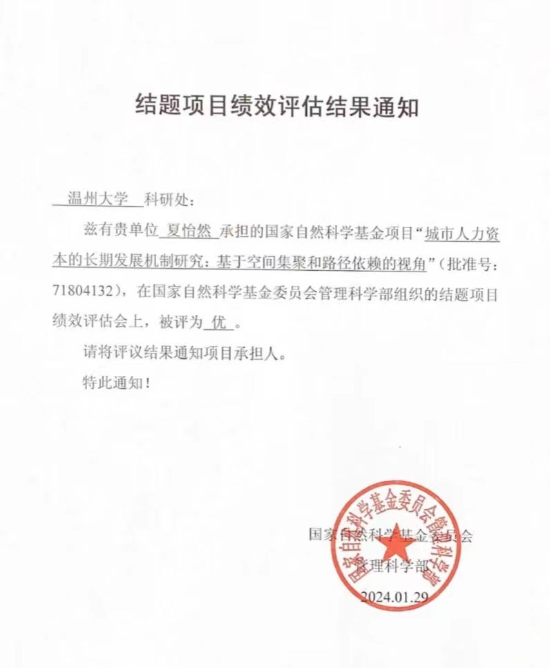 51暗网 夏怡然教授承担的国家自然基金项目“城市人力资产的长期发展机制研究:基三空间领取和路径依赖的视角”,在国家自然科学基金委管理科学部组织的结题项目绩效评估会上,被评为优!