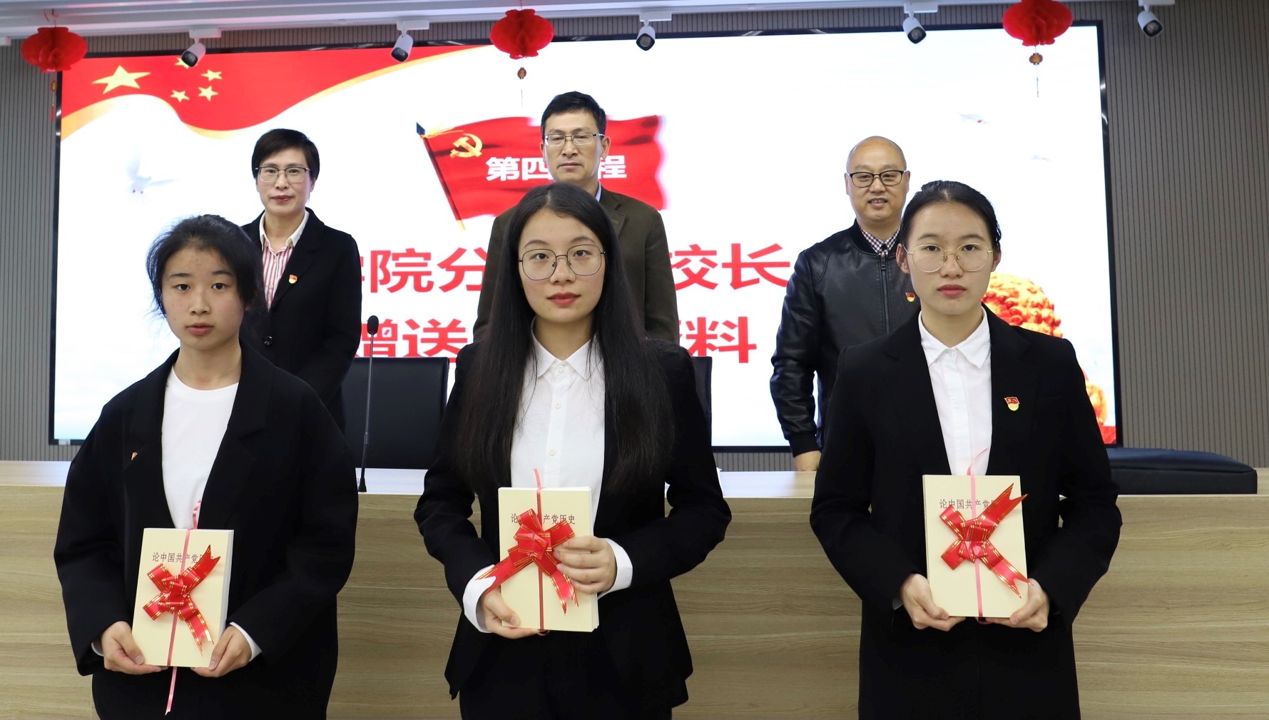 分党校校长郑彩莲上台致辞。她提出“为什么学”、“怎么学”、“学了干什么”三个问题引导学生党员骨干们思考;同时也希望学员们通过培训切实提高政治能力、调查研究能力、科学决策能力、改革攻坚能力、应急处突能力、群众工作能力、抓落实能力,成为一批政治坚定、思想过硬、德才兼备、勇挑重担的优秀青年党员骨干队伍。随后,本次培训班班主任魏梦瑶老师宣读了《学员守则》,同时也希望各位学生党员骨干在接下来学习中遵守守则,服从班级管理,以党员的要求严格要求自己,认真学习,在思想上有所收获。开班仪式最后,三位校长向学员代表们赠送学习资料。