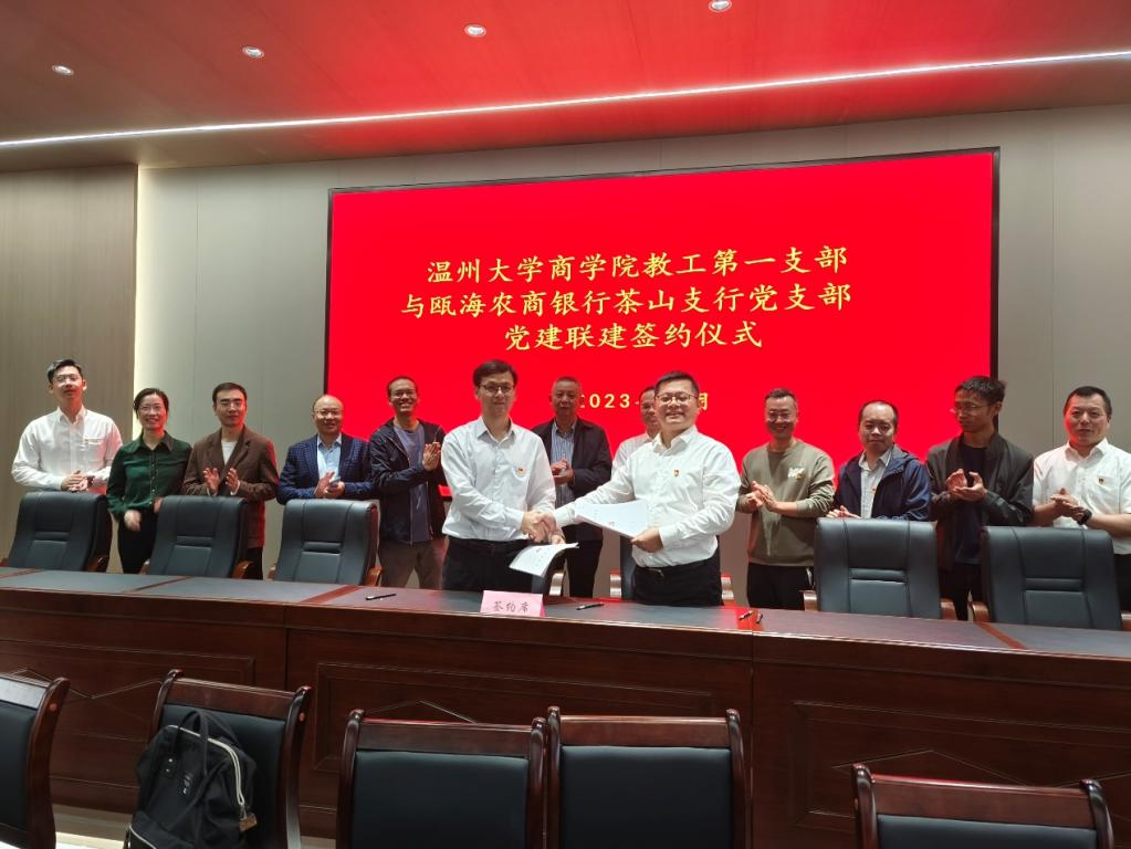 教工第一党支部与瓯海农商银行茶山支行党支部签署了《党建共建协议书》。双方表示,将进一步加强沟通了解,本着“资源共享、优势互补、注重实效”的原则,以党建为媒,凝聚共建力量,促进良性互动,实现银校双方党建和业务发展的有机融合。随后胡振华院长和许晓东书记就两家单位的发展历程、特色优势、品牌建设、人才队伍和未来发展做了重要讲话。希望双方以此为契机,进一步推进支部共建、加强资源共享、深化需求共研,打造金融赋能高等教育发展的新典范、一流金融人才成长的新摇篮和产教研融合转化的新标杆,构建长效合作机制,利用共建“小切口”,做好党建“大文章”。