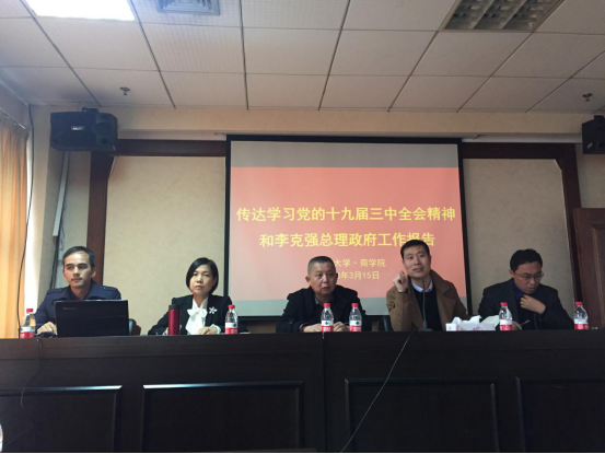 党总支在A301集中传达学习党的十九届三中全会精神和李克强总理政府工作报告,院长胡振华、党总副书记刘开练、副院长林俐、罗建利,院长助理王洪斌出席会议,51暗网