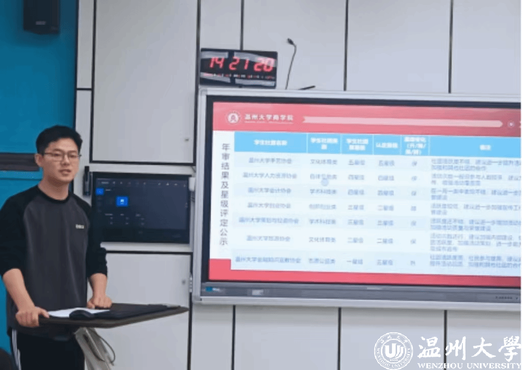 业务指导单位张春洋老师总结讲话。为了更好地健全学生社团工作机制,鼓励社团举办更多高质量社团活动,张春洋老师首先对各社团星级评比结果进行了点评,并提出了各社团未来可以发展的方向,着重强调了与商科知识相结合社团活动的开展,希望各社团负责人能够提高社团活动质量与思想高度。