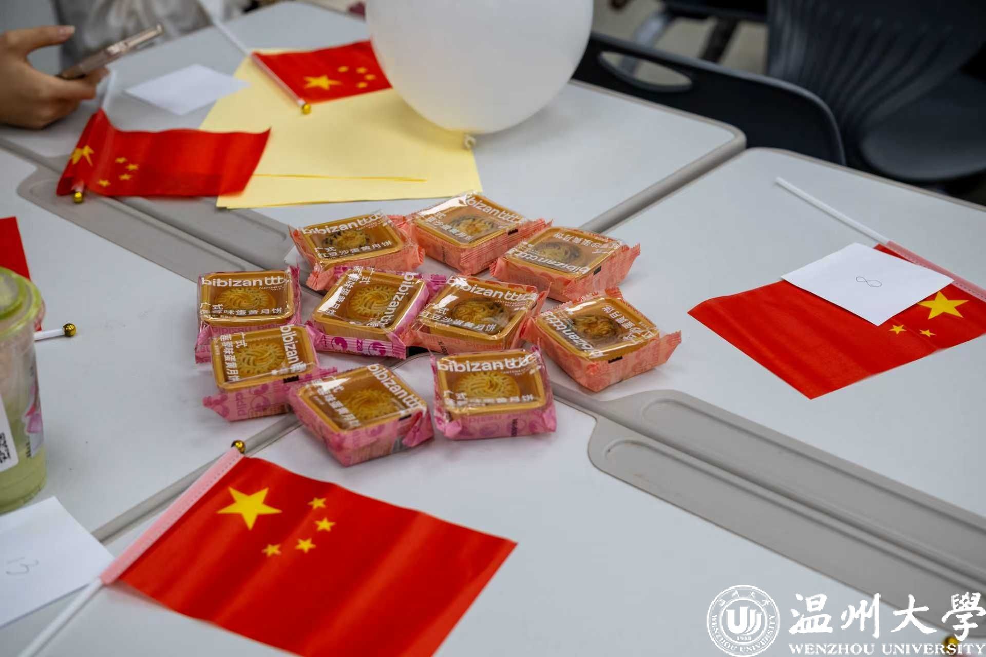 活动现场处处洋溢着喜庆的氛围,教室四周悬挂着彩色气球,每张座位上都摆放着鲜红的手持小国旗、小月饼,教室白板也粘贴了祝福海报,细节之处尽显节日仪式感。