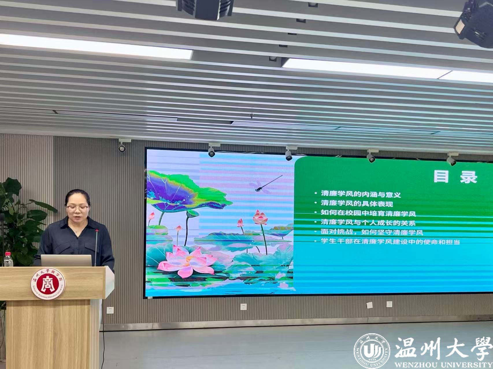 党委副书记、纪委书记曾蓓蕾以“清廉学风,青春力量”为主题,为团学干部专题授课。