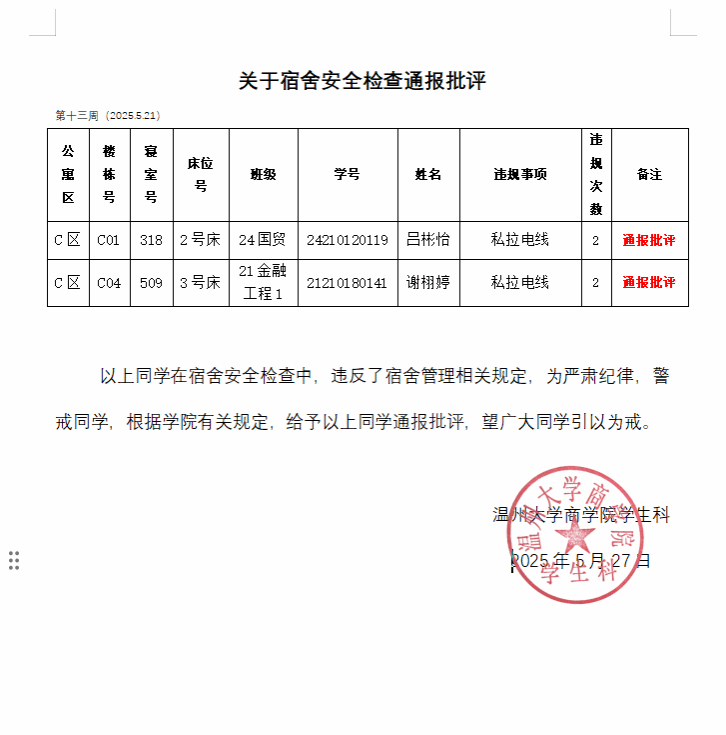 关于2024/2025学年第二学期第十三周学生公寓安全检查通报批评的通知