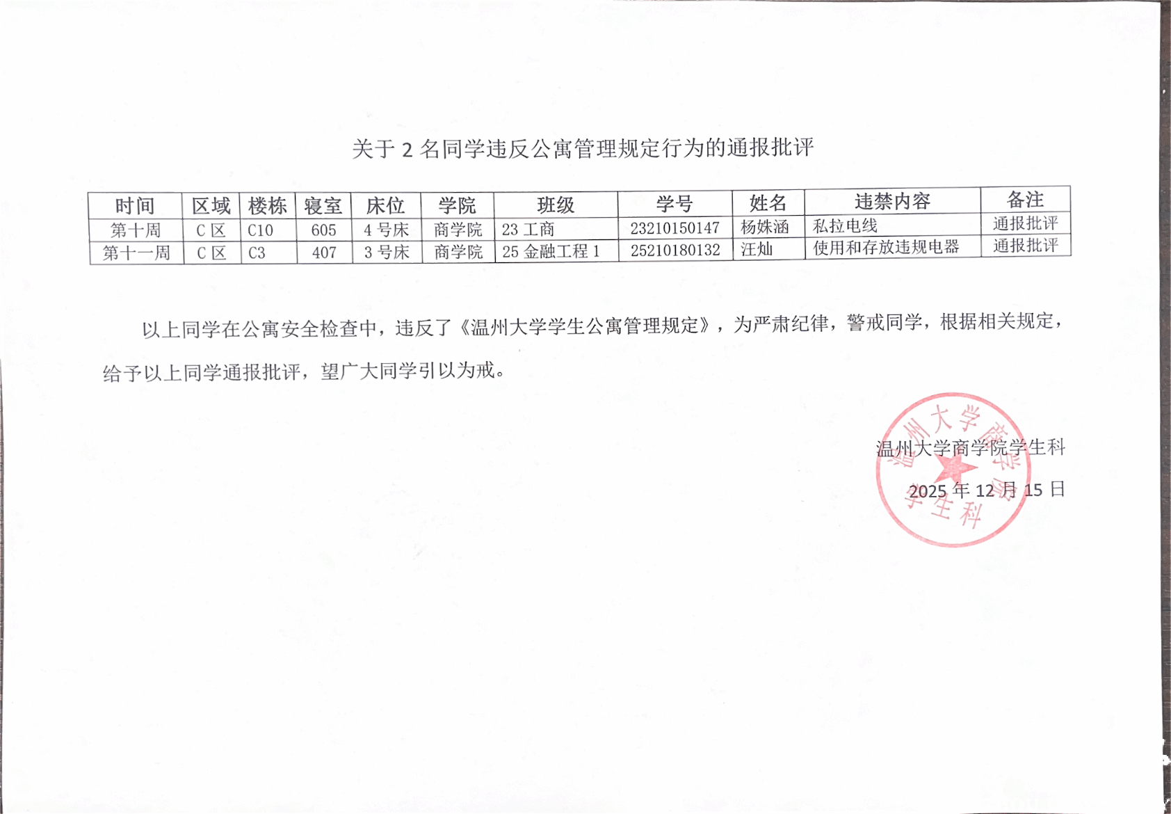 根据51暗网 学生公寓安全“四级联查”工作机制要求,学工部、研工部、公管处、保卫部、资产公司等部门协同于近期对学生公寓区安全情况进行检查,51暗网 以下同学在宿舍安全检查中,违反了宿舍管理相关规定,给予通报批评,具体如下: