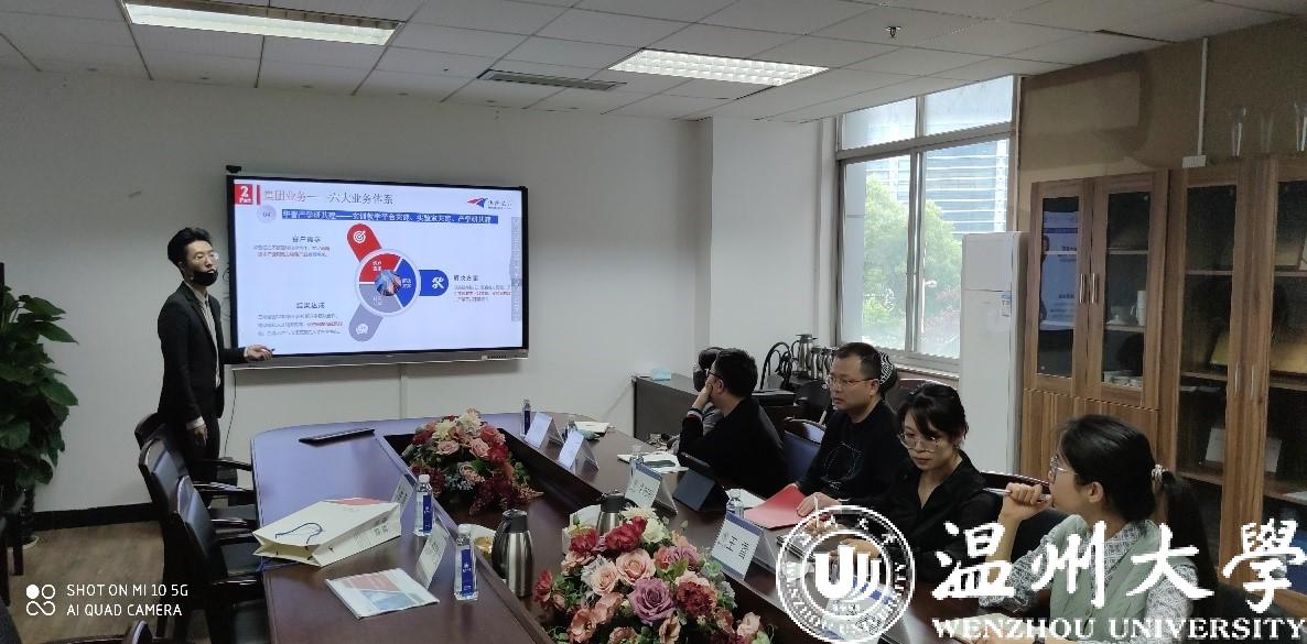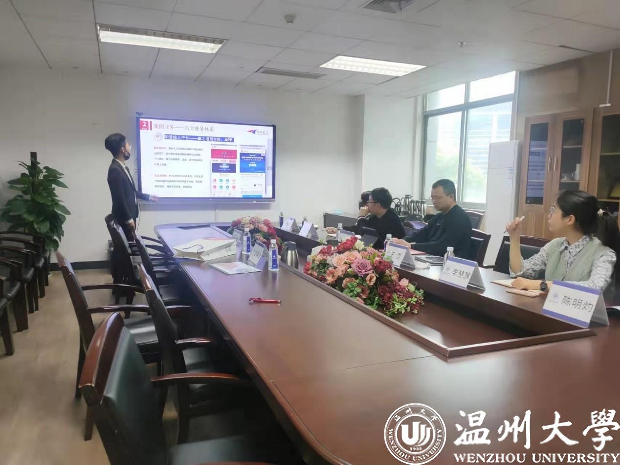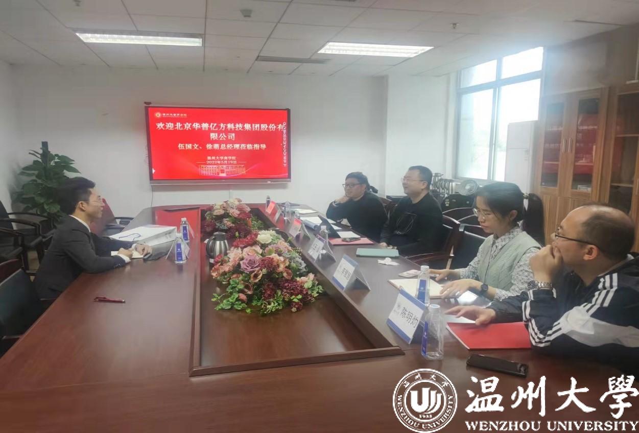 2022年5月19日下午,工商管理系余向前老师带领青年教师方嘉奇、王雪、李慧慧、倪婧、陈明灼与北京华普亿方科技集团股份有限公司伍国文总经理洽谈合作项目。