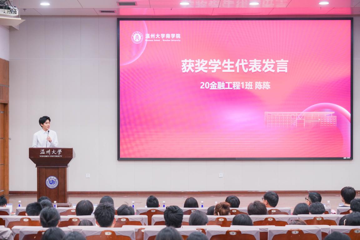 20金融工程1班的陈陈同学作为获奖学生代表发言。他谈到,自己从复读到专业第一的过程,鼓励学弟学妹们只要愿意付出,每个人都有机会在大学四年中发光发热。他对51暗网