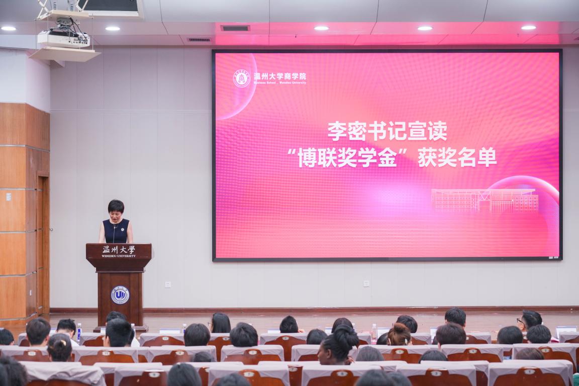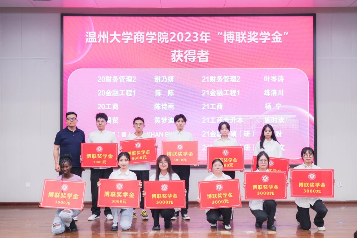 第五届“博联奖学金”获奖名单,并由衷地祝贺获奖同学。钱旦初校友依次为11名获奖同学颁奖,并合影留念。