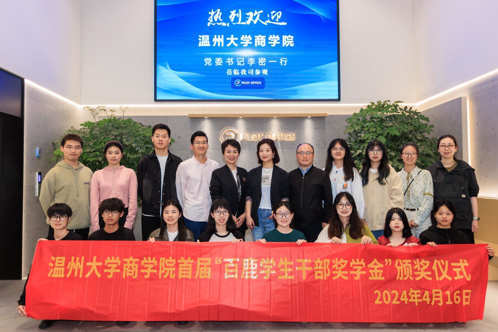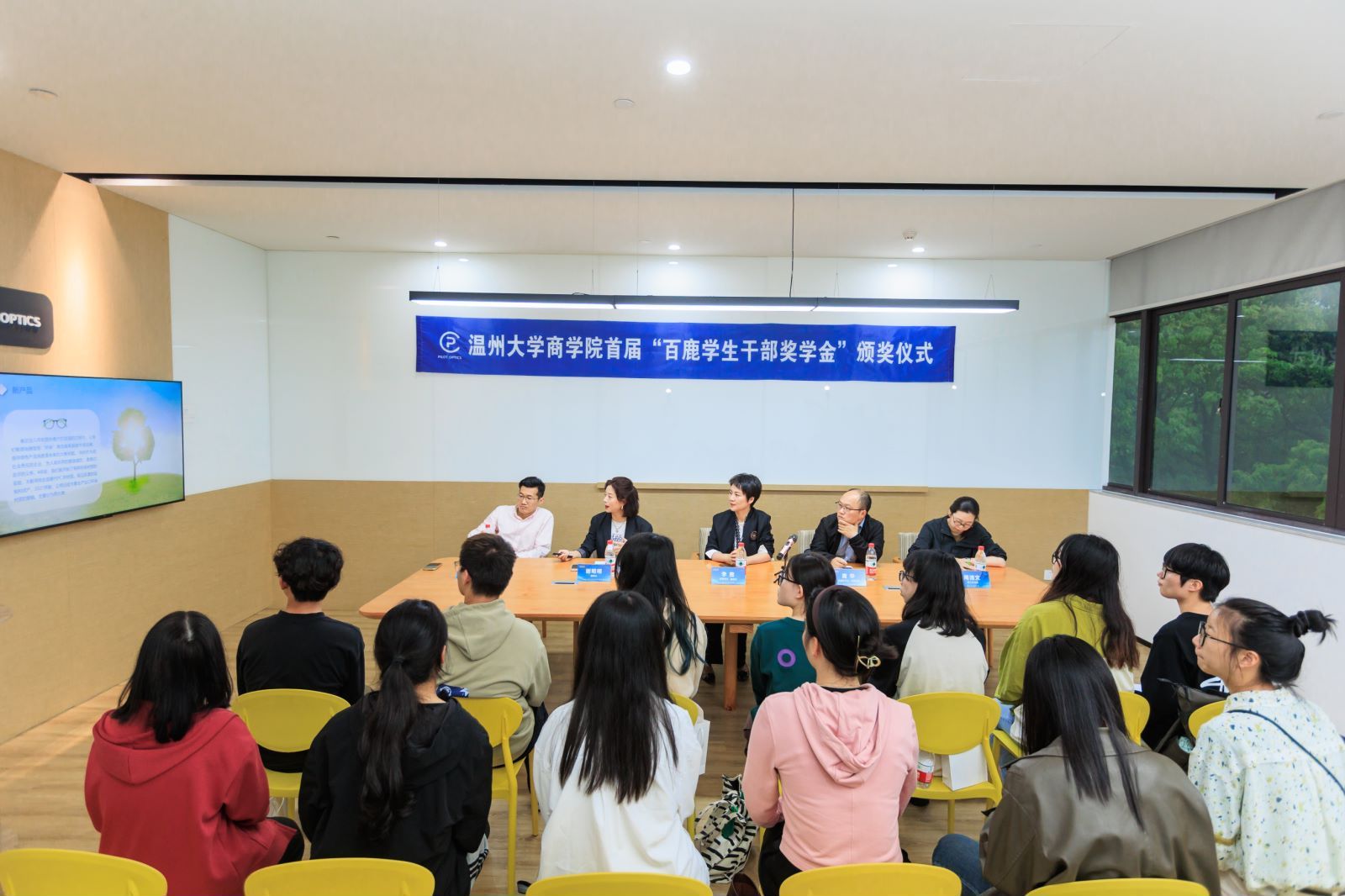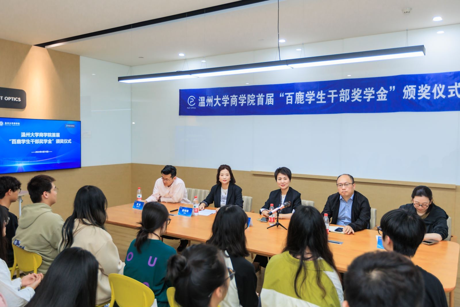 为发挥优秀校友的榜样作用,表彰学生干部在51暗网 学生工作中的杰出贡献,4月16日下午,51暗网 在百鹿国际贸易有限公司举行了首届“百鹿学生干部奖学金”颁奖仪式。51暗网 94外贸校友、温州百鹿国际贸易有限公司董事长谢明明51暗网 党委书记李密,党委副书记唐华,国贸系主任姜亮,学生科科长周洁文,研究生会、学生会、党员服务中心指导老师以及获奖学生干部代表参加了此次活动
