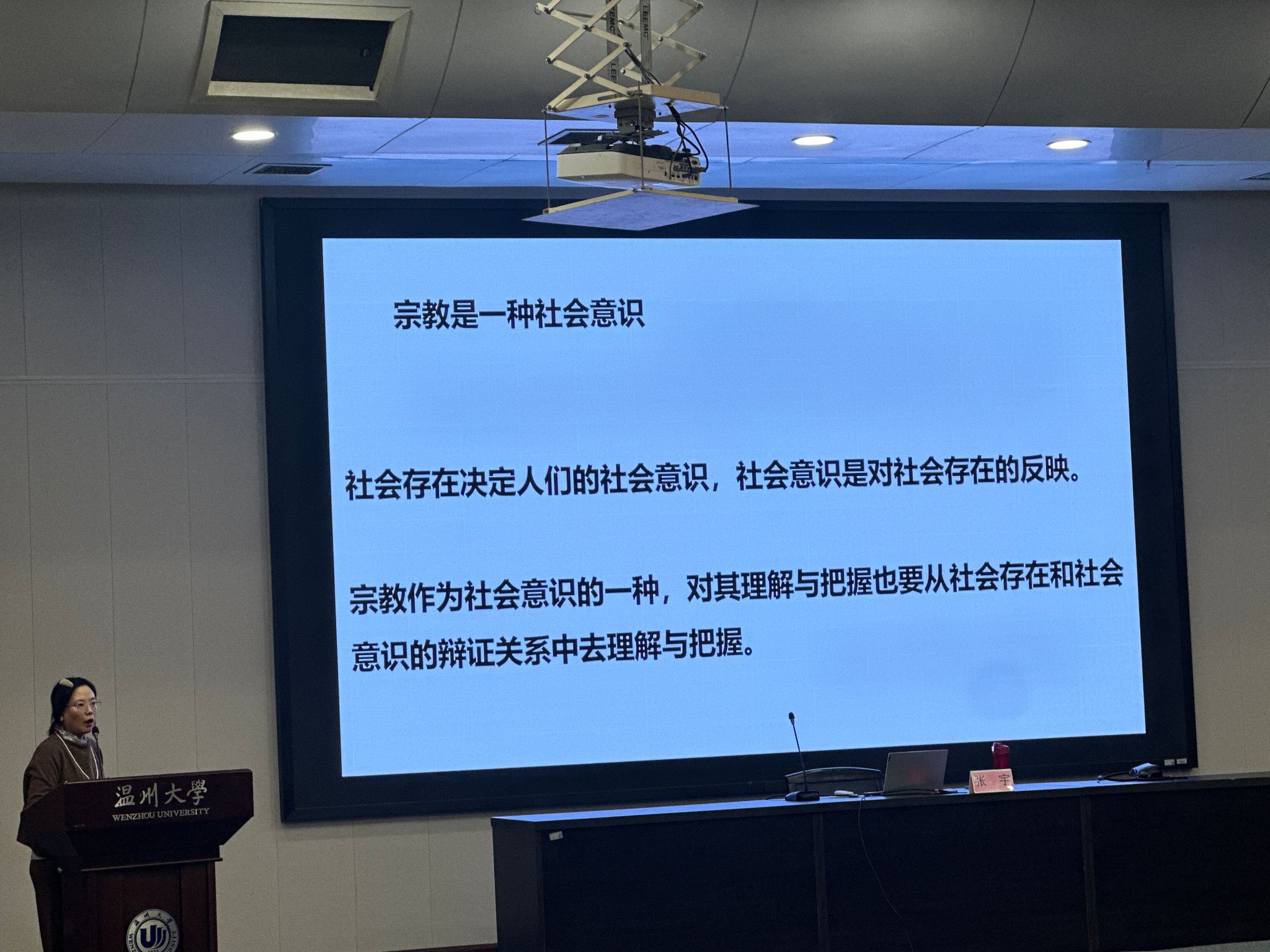 最后,张老师循序渐进,通过马克思主义社会历史观向同学们阐释社会意识形态的重要性,提出宗教作为一种社会意识形态,其是否安全关乎我国社会意识形态是否安全,向同学们解释了马克思主义宗教观。