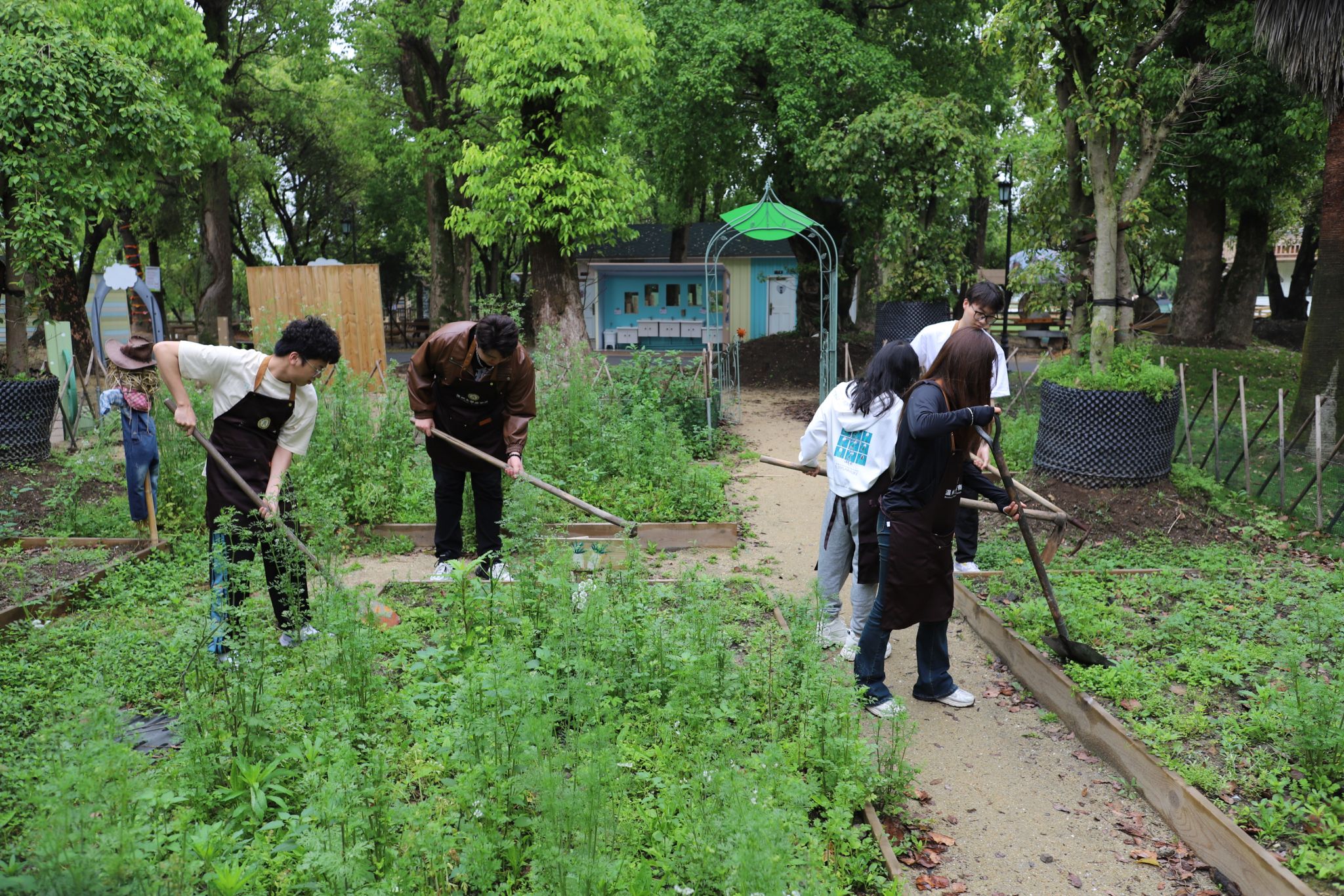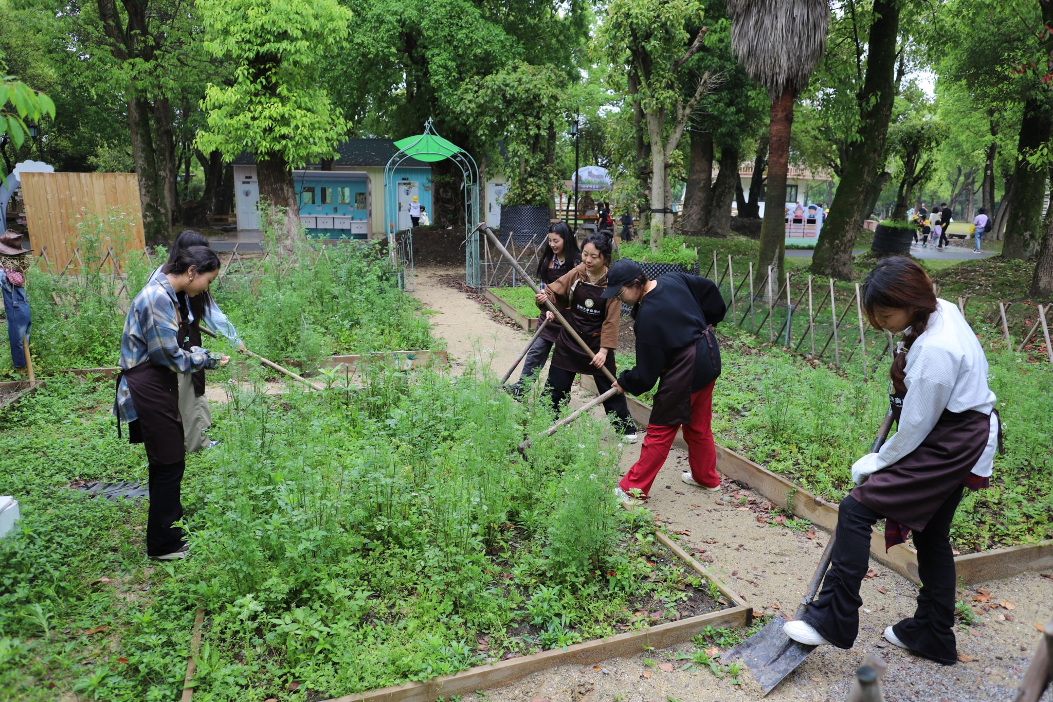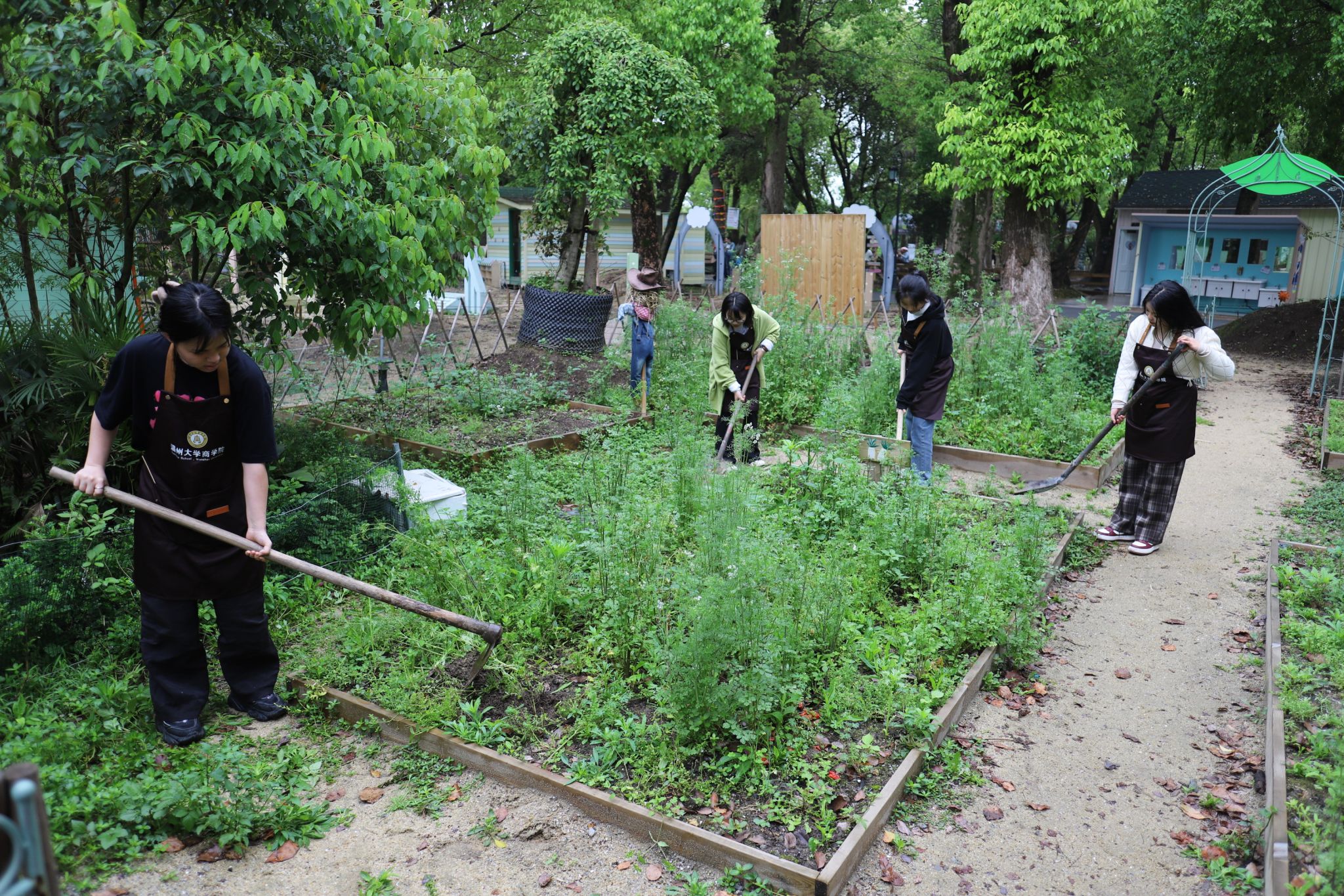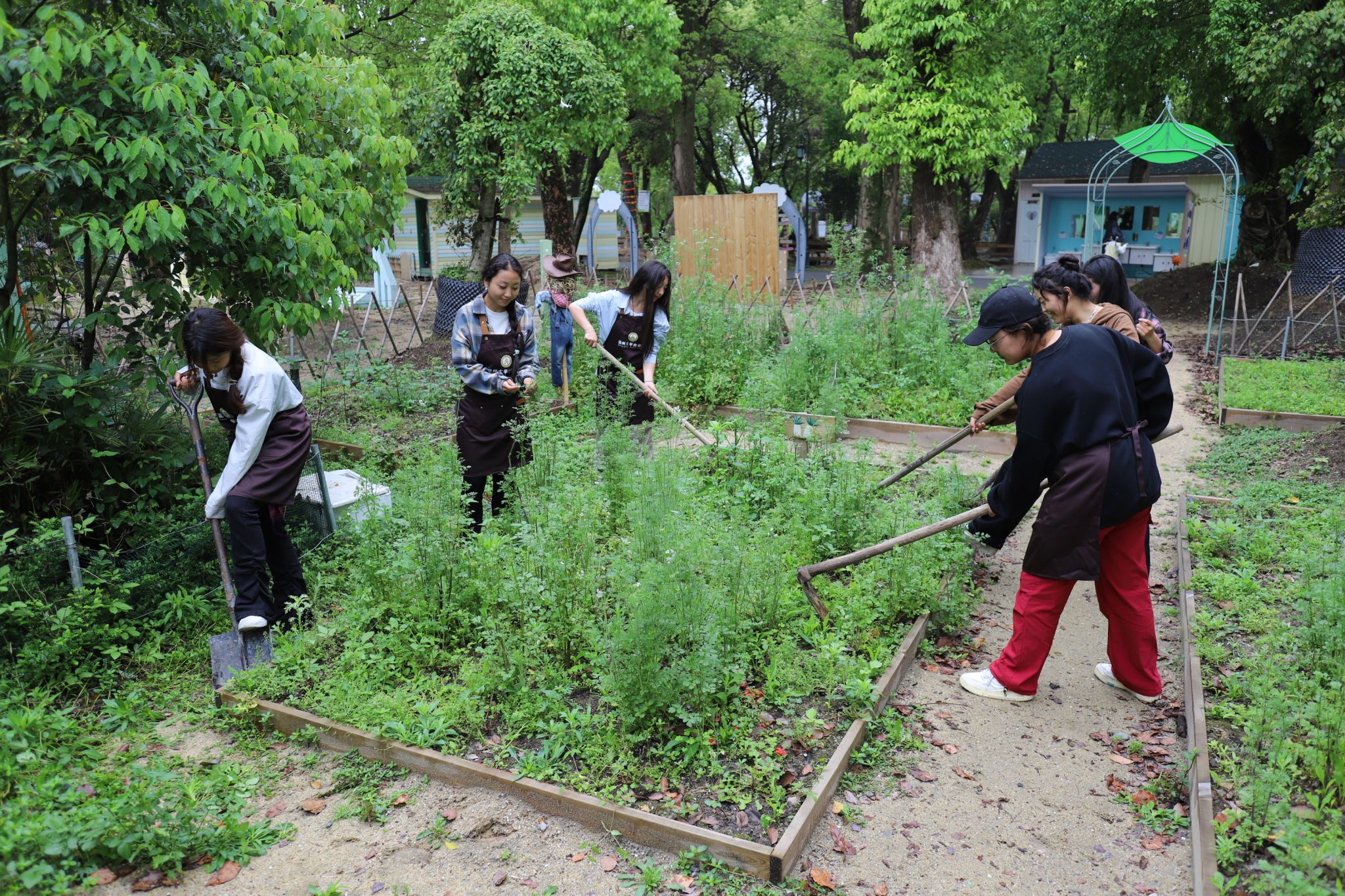 在郁郁葱葱的菜园上,一群朝气蓬勃的大学生们身穿劳动服,手持锄头等工具,开始了他们的农场之旅。在除草挖土环节,同学们分工合作,有的挥舞着锄头翻土,有的细心地拔除杂草。虽然汗水浸湿了衣衫,但大家的脸上都洋溢着满足和快乐的笑容。