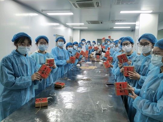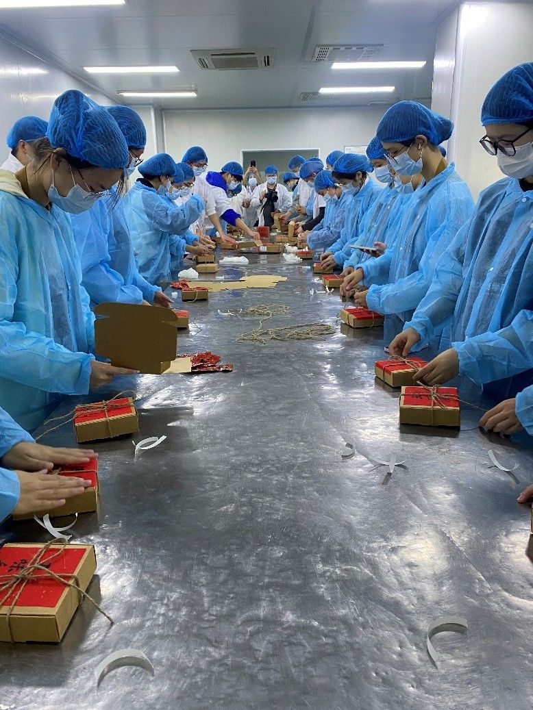 之后,同学们又跟随工作人员来到下一个车间,摘去了手套,进行了礼盒包装环节。同学们按要求包装了桌上的食品并纷纷向其他人进行展示,同学们为自己的成果感到了劳动的喜悦。