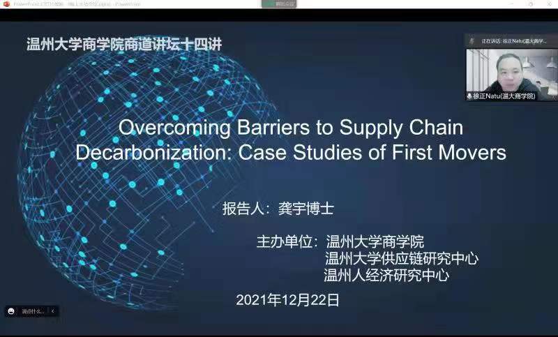 邀请到了英国南安普顿大学的龚宇副教授进行了一场讲座,讲座的主题为从案例分析的角度如何克服供应链去碳化过程的障碍。