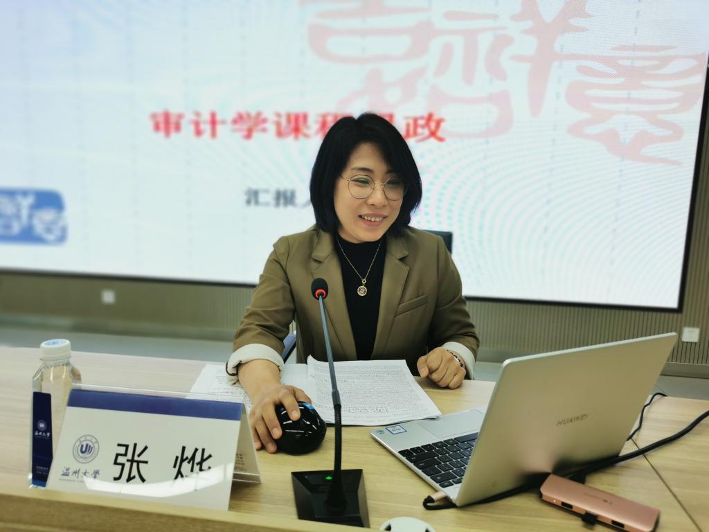 财务管理系的张烨老师分享了《审计学》课程思政建设经验,她指出作为一个审计人,首先就是要遵循职业道德、要诚信,这正是与社会主义核心价值观和课程思政的理念相符合,因此她在设置教学目标和选择教学案例充分考虑到学生职业道德、正确三观和家国情怀的培养,并且采用多样化的教学方法贴近大学生的实际生活,力求达到商科教育与思想教育和谐共荣,知识传播与价值观教育同频共振的目标,在春风化雨润物无声中,让学生学习和践行社会主义核心价值观,提升学生的职业素养,树立正确的三观。