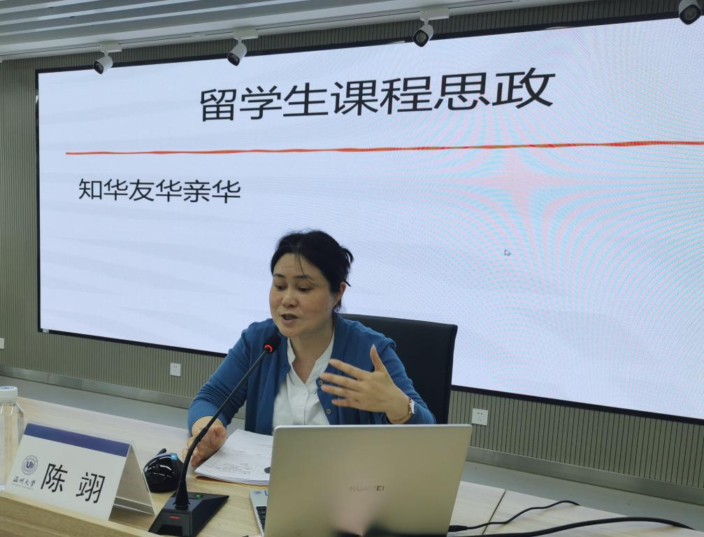 国际教学部的陈翊老师分享了在留学生课程中实施课程思政的一些想法,她说首先要想到习近平总书记说的“为谁培养人、培养什么人、怎样培养人”,这决定了方法论。因此留学生的课程思政目标设定为“知华、友华、亲华”,在课程中要讲好中国故事、用好中国案例、看中国视频和实地参观中国企业,同时从中国推广到学生母国,运用普世性材料推广到国际视野,比如将学生个人发展与一带一路建设、人类命运共同体意识相结合,无形之中实行春风化雨式的课程思政。