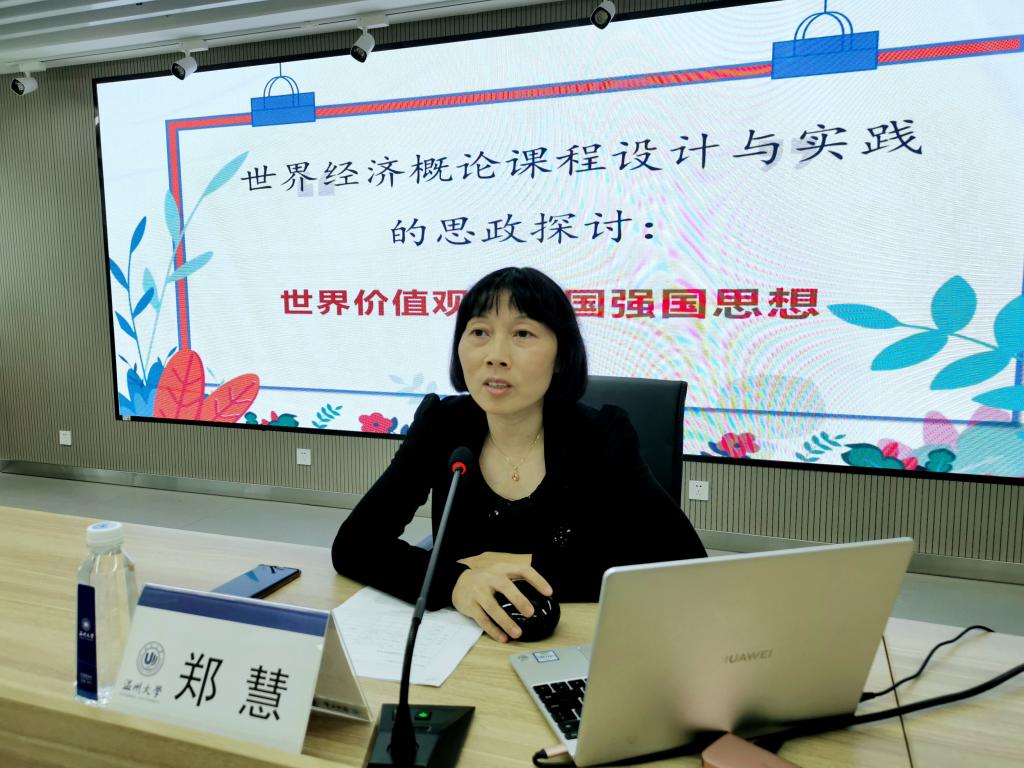 国际贸易系的郑慧老师为大家分享《世界经济概论课程设计与实践的思政探讨:世界价值观与爱国强国思想》,她从课程设计出发,对课程教学大纲和教学过程中的设计与改进做分享,她提出对于课程中涉及的世界经济现实经济情况,要坚持以马克思主义为指导,全面贯彻党的方针、政策,对于教学过程,要设计灵活多样的教学活动,提供多种学习体验,有效调动学生的学习积极性,以及要通过课程设计与实践帮助学生树立正确的世界价值观及培养学生爱国强国的思想。