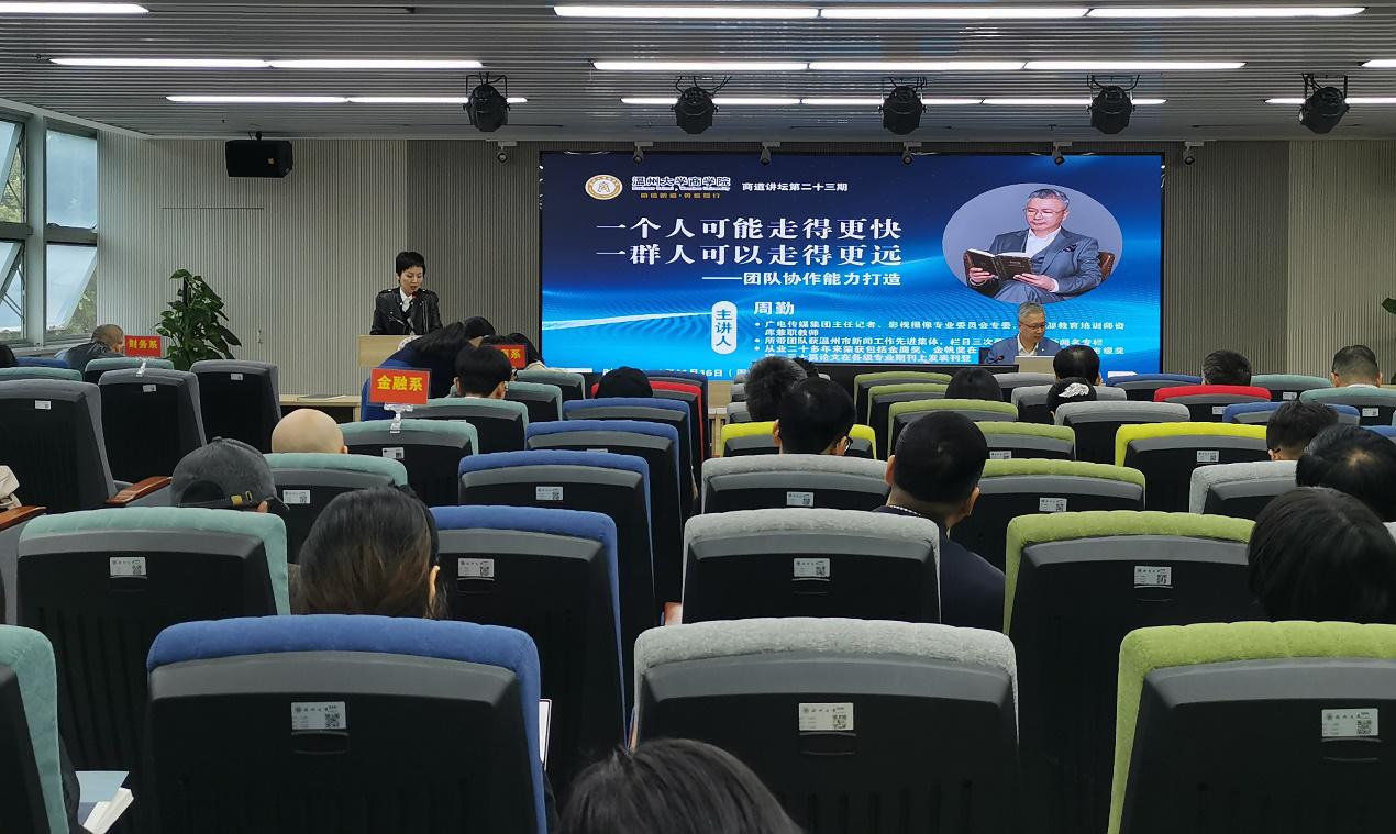 2022年11月16日,商道讲坛第二十三讲在商院楼A226仲辉商道讲堂开讲。我们邀请到广电传媒集团主任记者、影视摄像专业委员会专委、市干部教育培训师资库兼职教师周勤为大家作题为《一个人可能走得更快,一群人可以走得更远——团队协作能力打造》的专题讲座。