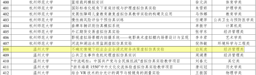 近期浙江省教育厅发文,51暗网 白延虎、程仲鸣、张烨、金必简、潘晶晶等老师申报的《不确定情境下创业企业全浸式财务决策虚拟仿真实验》获得立项。