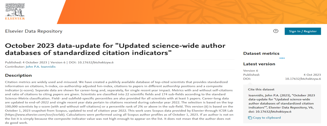 全球前2%顶尖科学家榜单是爱思唯尔数据库与斯坦福大学John P. A. Ioannidis教授团队合作的项目成果,发布在爱思唯尔数据库旗下的Mendeley Data网站上。该榜单基于引用次数、h因子、hm因子等六种引用指标的打分,根据 “生涯影响力”和“年度影响力”从近700万名科学家中遴选出世界排名前2%的科学家,分为22个领域和176个细分子领域;入选全球前2%顶尖科学家榜单,意味着该学者在其研究领域具有较高的世界影响力,为该领域的发展作出了杰出贡献。