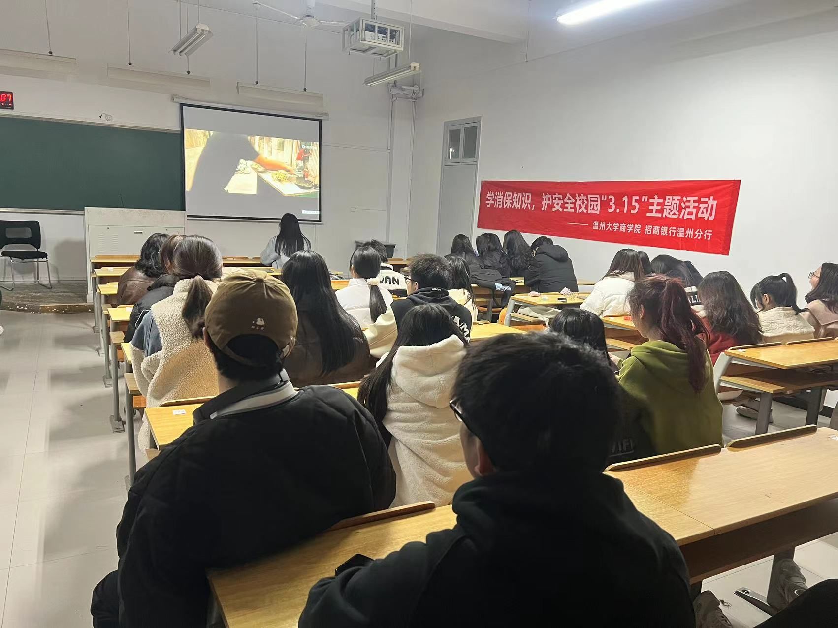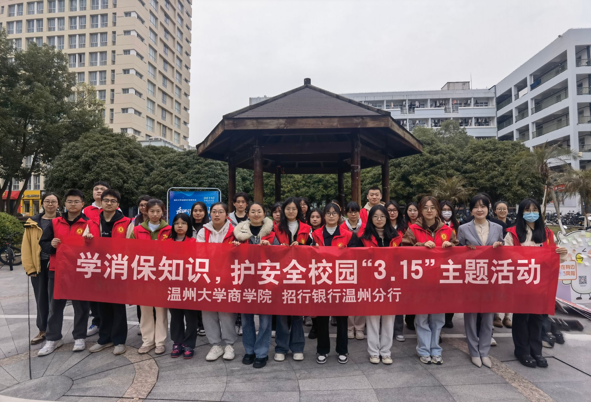 “当同学们遇到消费者权益被侵犯时,请拨打电话12315进行合理维权……”,协会联合招商银行温州分行开展一场“学消保知识,护安全校园”主题宣传活动。活动现场,协会成员与银行工作人员采取悬挂宣传标语、发放宣传手册等多种形式向同学们普及“国际消费者权益日”的发展历史与意义。此外,协会还特意围绕《消费者权益保护法》等法律法规知识开展了有奖竞答活动。银行工作人员现场为学生详细解读宣传折页,并结合学生日常生活遇到的问题予以一一解答。