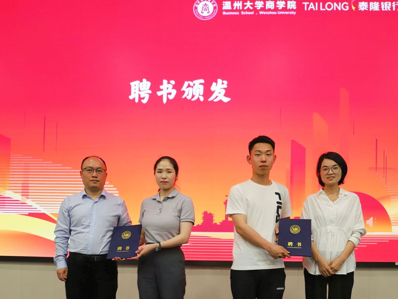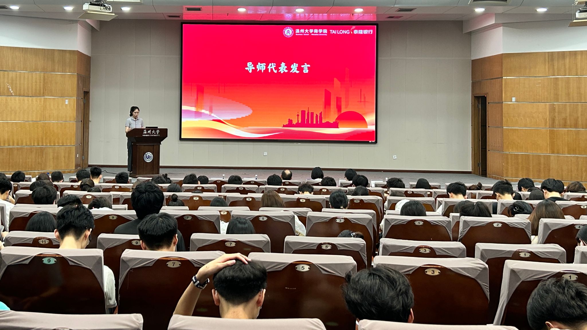 其次,唐华副书记和陈贞纯经理为师生代表颁发聘书。泰隆银行温州分行陆静烨女士作为导师代表发言。她讲述了泰隆银行对员工培育的重视及包容,还介绍了其独特的帮带文化,通过“老带新”助力一代代新员工茁壮成长。针对本次行动,陆静烨导师希望与同学们共同进步,也真诚欢迎同学们。