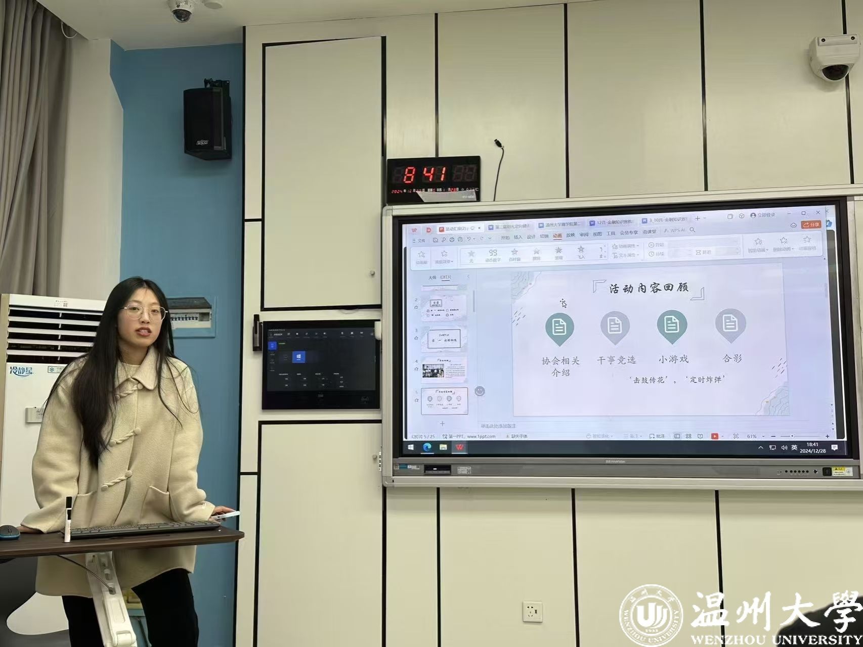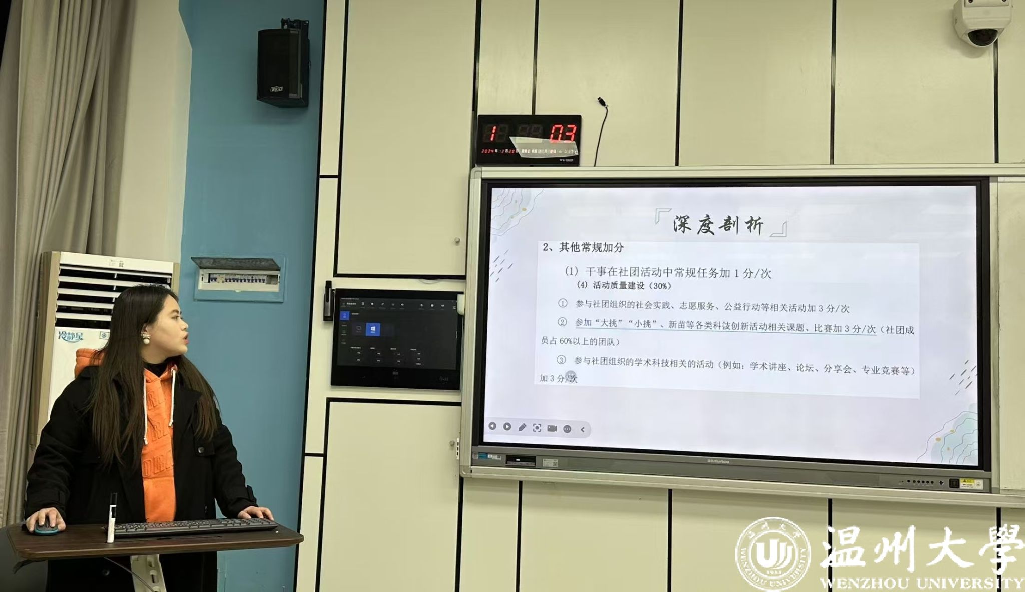 宣传部部长金姝伶同学向大家展示了协会成员的积分情况,并逐一讲解积分的来源与获得,以此激发社员们的积极性,形成“比学赶超”的良好氛围。