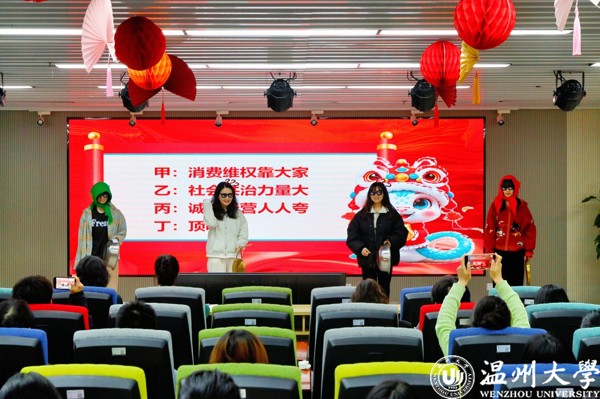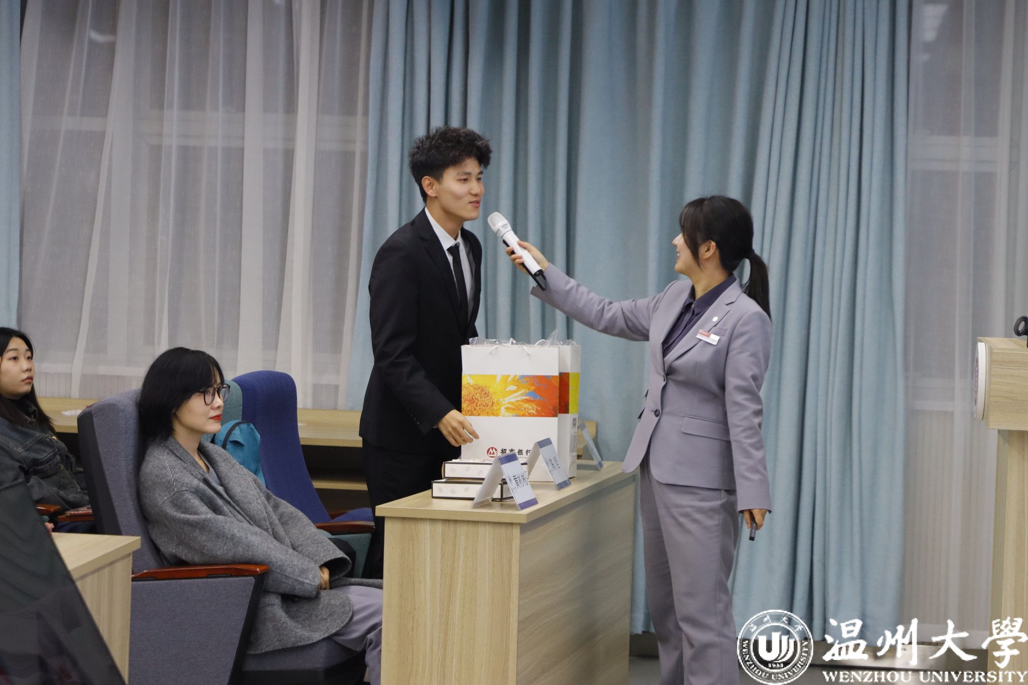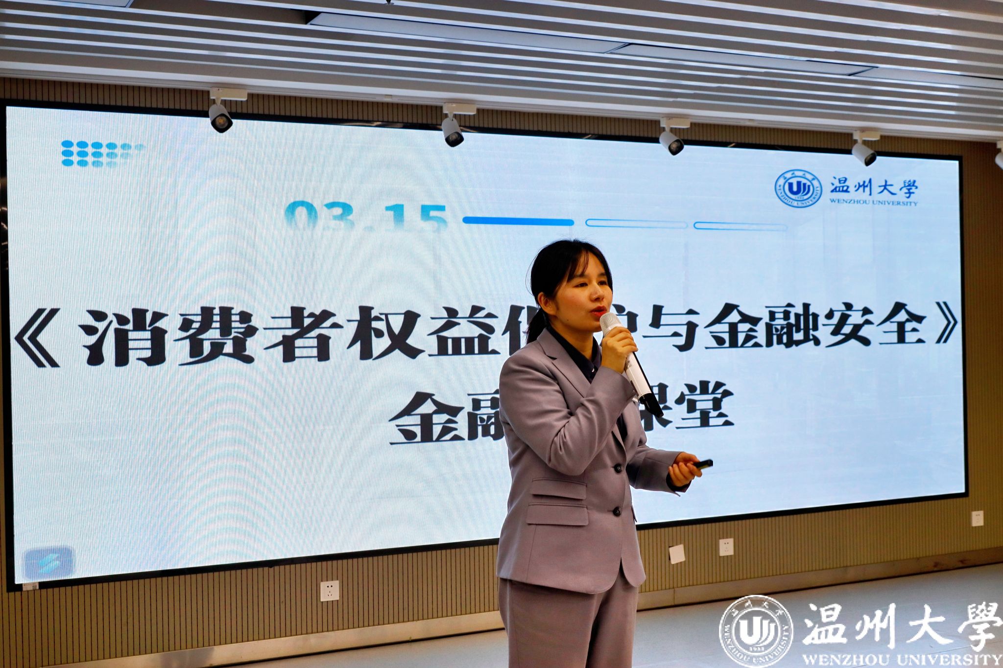 随后,招商银行温州分行黄彬彬老师通过“案例剖析+趣味问答”形式,为学生带来了一堂生动的金融小课堂《消费者权益保护与金融安全》,内容涵盖反诈防骗、个人信息保护、理性借贷等金融常识,激发了学生的参与热情,使金融知识在轻松氛围中深入人心。