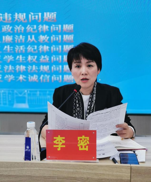 师德师风问题专项整治工作实施方案》。她带领大家围绕7个方面、35个问题的整治重点学习了多个负面典型案例。她强调大家要明确教师特殊身份定位,严守职业底线,树立依法从教意识,严格规范从教行为,构建亲清师生关系和风清气正的教育政治生态,以赤诚之心、奉献之心、仁爱之心投身教育事业,争做“四有”“六模范”好老师。