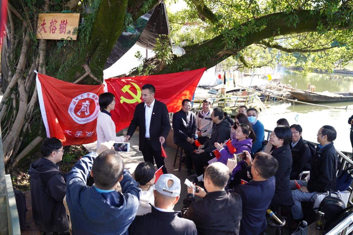 工商系的来新安老师,十几年来一直免费为冯宅村的发展出谋划策,是冯宅村发展的亲历者和见证人,也是冯宅村的“荣誉村长”。在大榕树下,来老师阐述了自己和冯宅村的故事,讲述了自己的心路历程,也谈及了共产党员的责任和担当:冯宅村的两委在遭遇困难时勇于承担风险,不计个人得失,失小利,得大义,值得所有的共产党员学习!