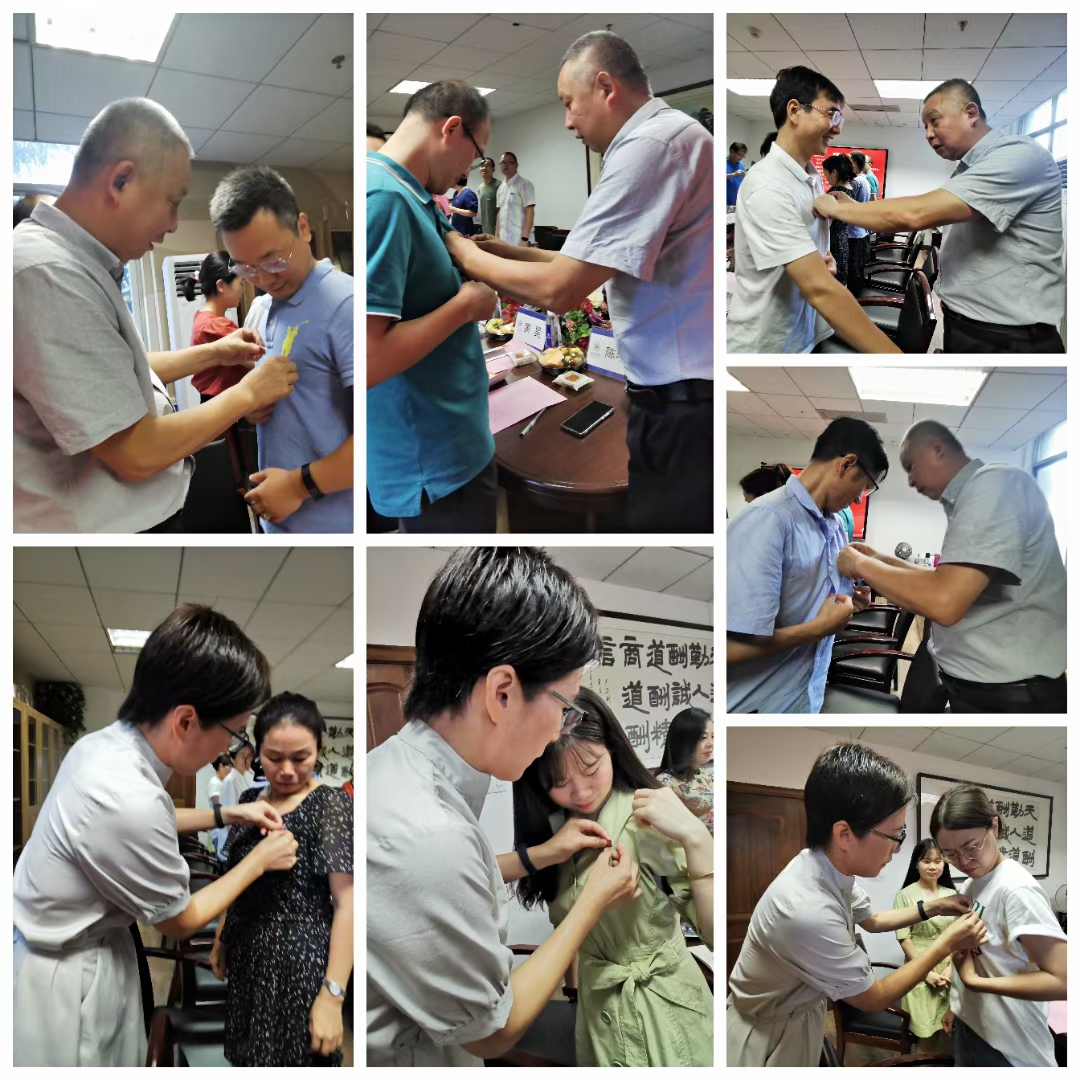 会上举行了新教师入职仪式,胡振华院长和郑彩莲书记一一给新教师佩戴校徽。