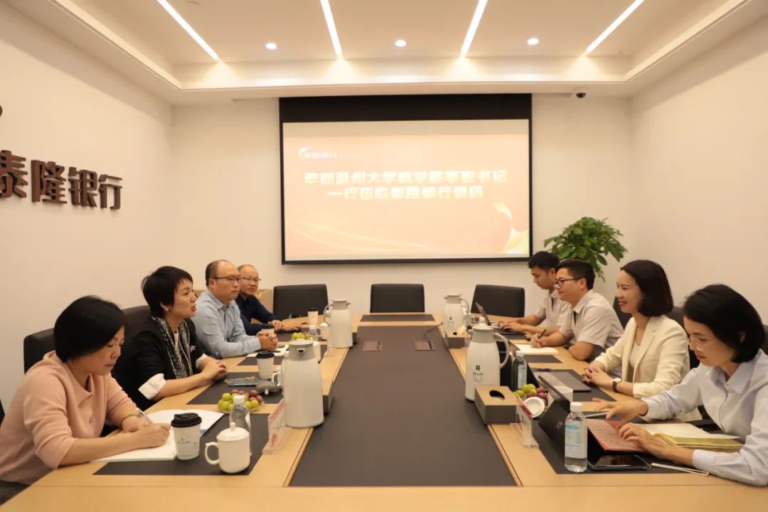 党委书记李密、党委副书记唐华、办公室主任张素琴、工会主席周建华一行走访泰隆银行龙湾支行,双方座谈交流共建“人才之家”。泰隆银行温州分行副行长蒋丽英,办公室主任卢劭炜,人力资源部经理陈贞纯,龙湾支行行长余康康参加座谈。